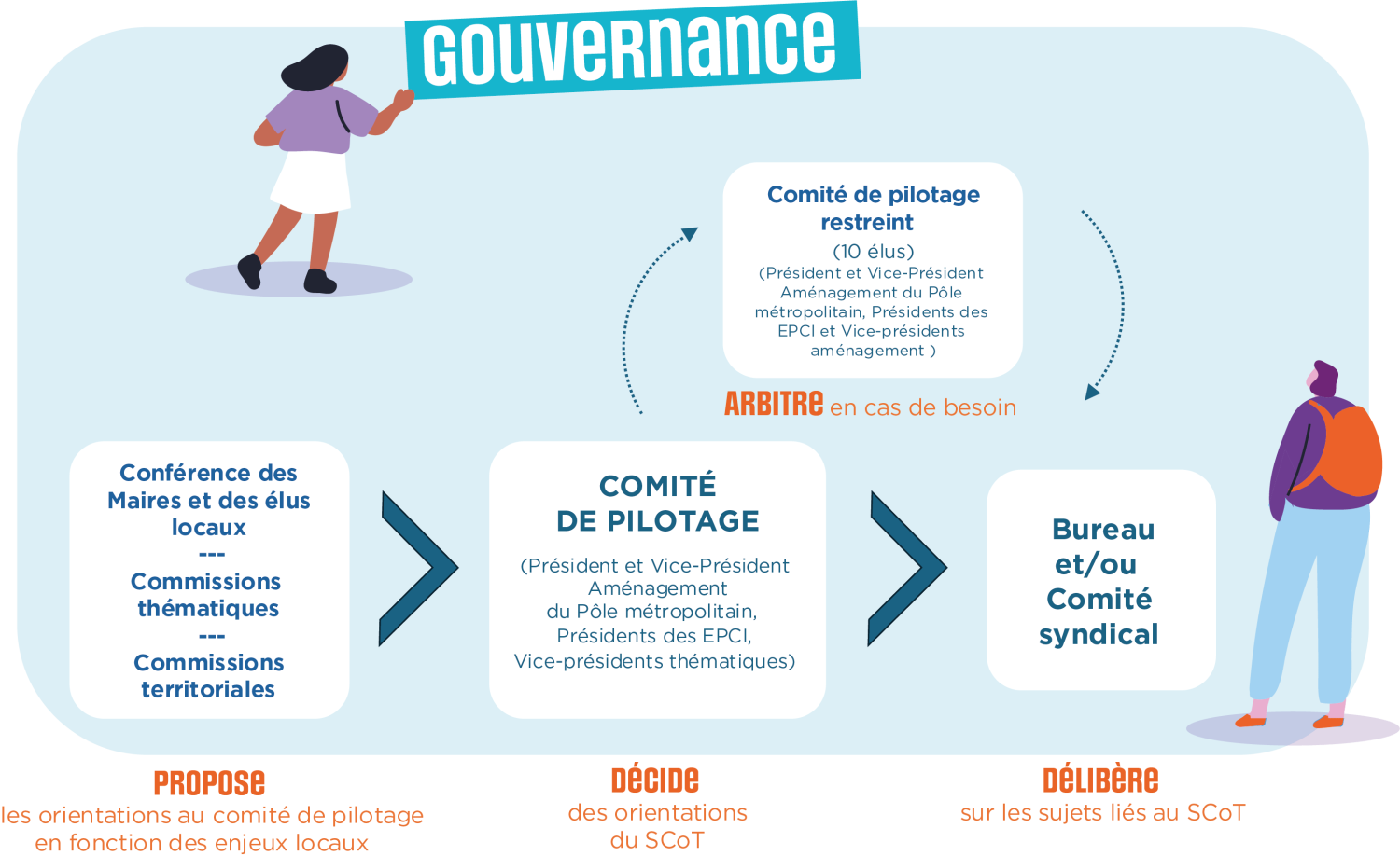 La gouvernance du SCoT repose sur trois grands niveaux d’organisation, auxquels s’ajoute la participation des habitants et des partenaires du territoire.